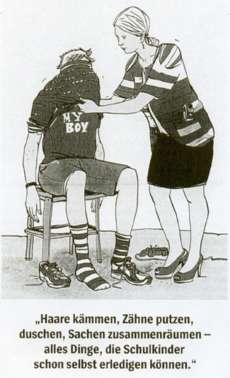 Selbst beim Haarekämmen, Zähneputzen, Duschen, Sachenzusammenräumen - alles Dinge, die kleine Schulkinder von ihrer Entwicklung her schon selbst erledigen können müssten - erhielten sie Hilfe von ihren Eltern.