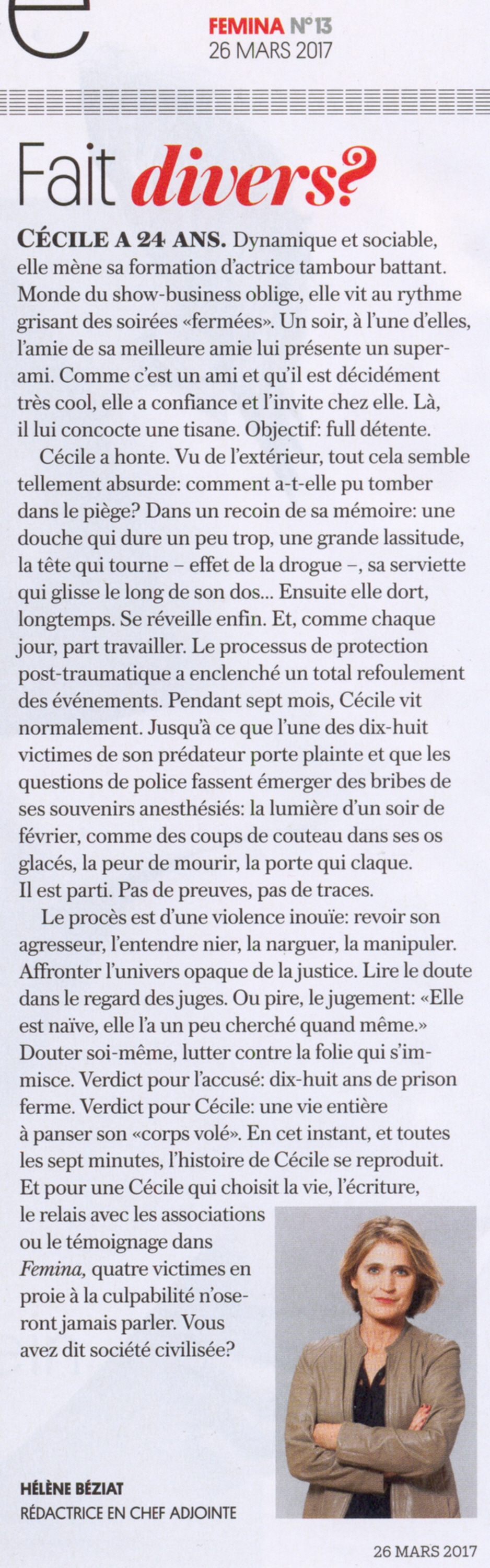 Le procès est d'une violence inouïe: revoir son agresseur, l'entendre nier, la narguer, la manipuler. Affronter l'univers opaque de la justice. Lire le doute dans le regard des juges. Ou pire, le jugement: "Elle est naïve, elle l'a un peu cherché quand même." Douter soi-même, lutter contre la folie qui s'immisce. Verdict pour l'accusé: dix-huit ans de prison ferme. Verdict pour Cécile: une vie entière à panser son "corps volé". En cet instant, et toutes les sept minutes, l'histoire de Cécile se reproduit. Et pour une Cécile qui choisit la vie, l'écriture, le relais avec les associations ou le témoignage dans Femina, quatre victimes en proie à la culpabilité n'oseront jamais parler. Vous avez dit société civilisée?